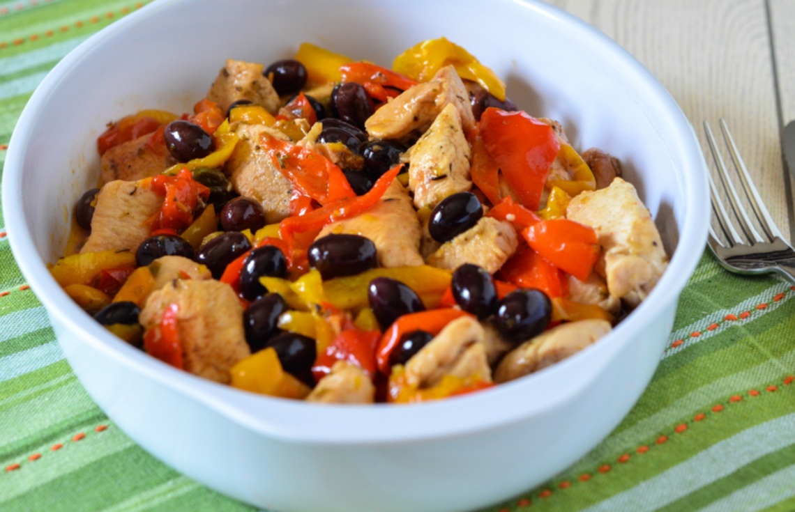 270kcal a porzione Per 2 persone: 400g di petto di pollo 1 cipolla rossa, 1 peperone rosso, 1 giallo, 1