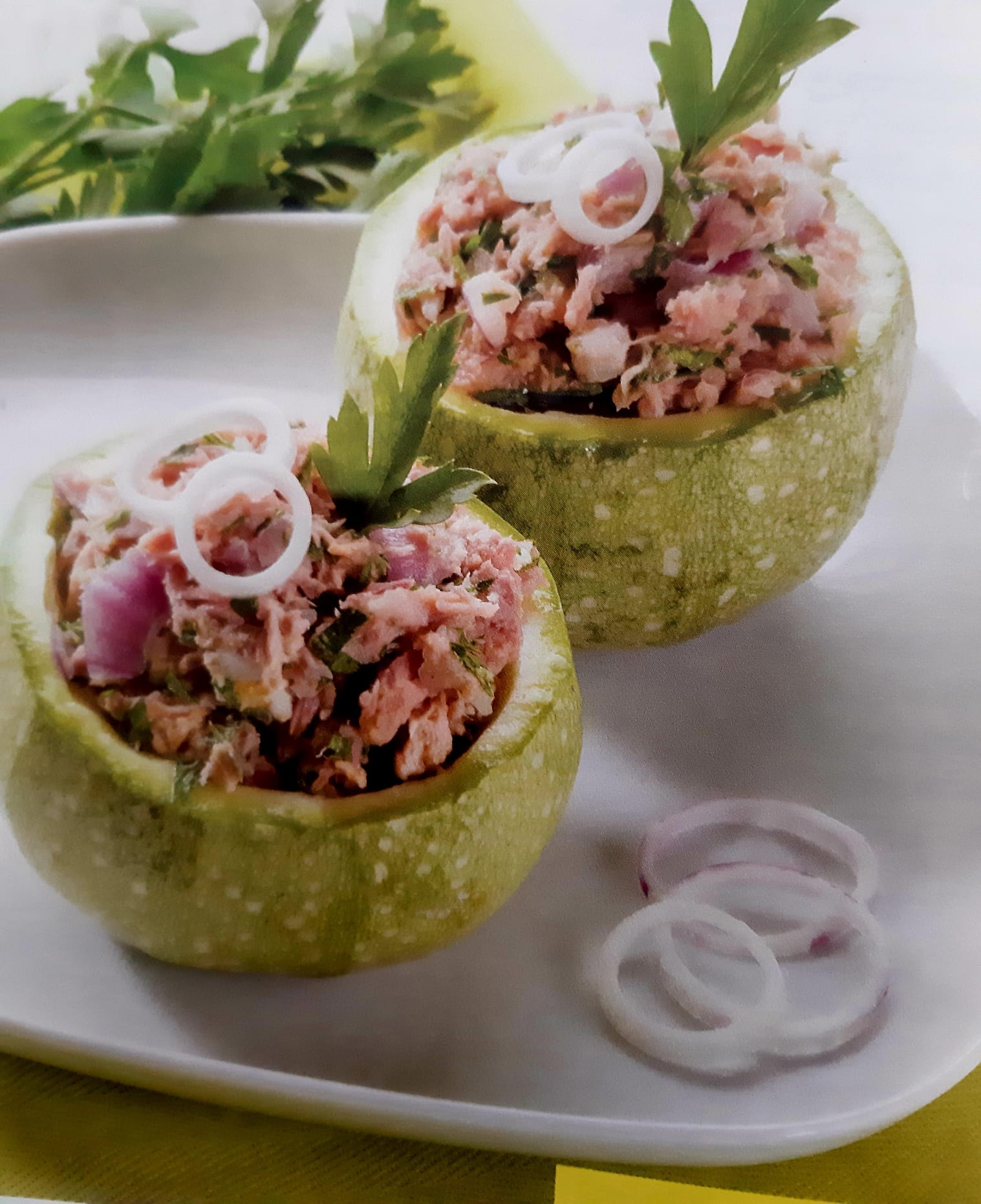 218kcal a porzione Per 2 persone: 2 zucchine tonde 200g tonno sott’olio sgocciolato o al naturale 1 cipolla rossa o